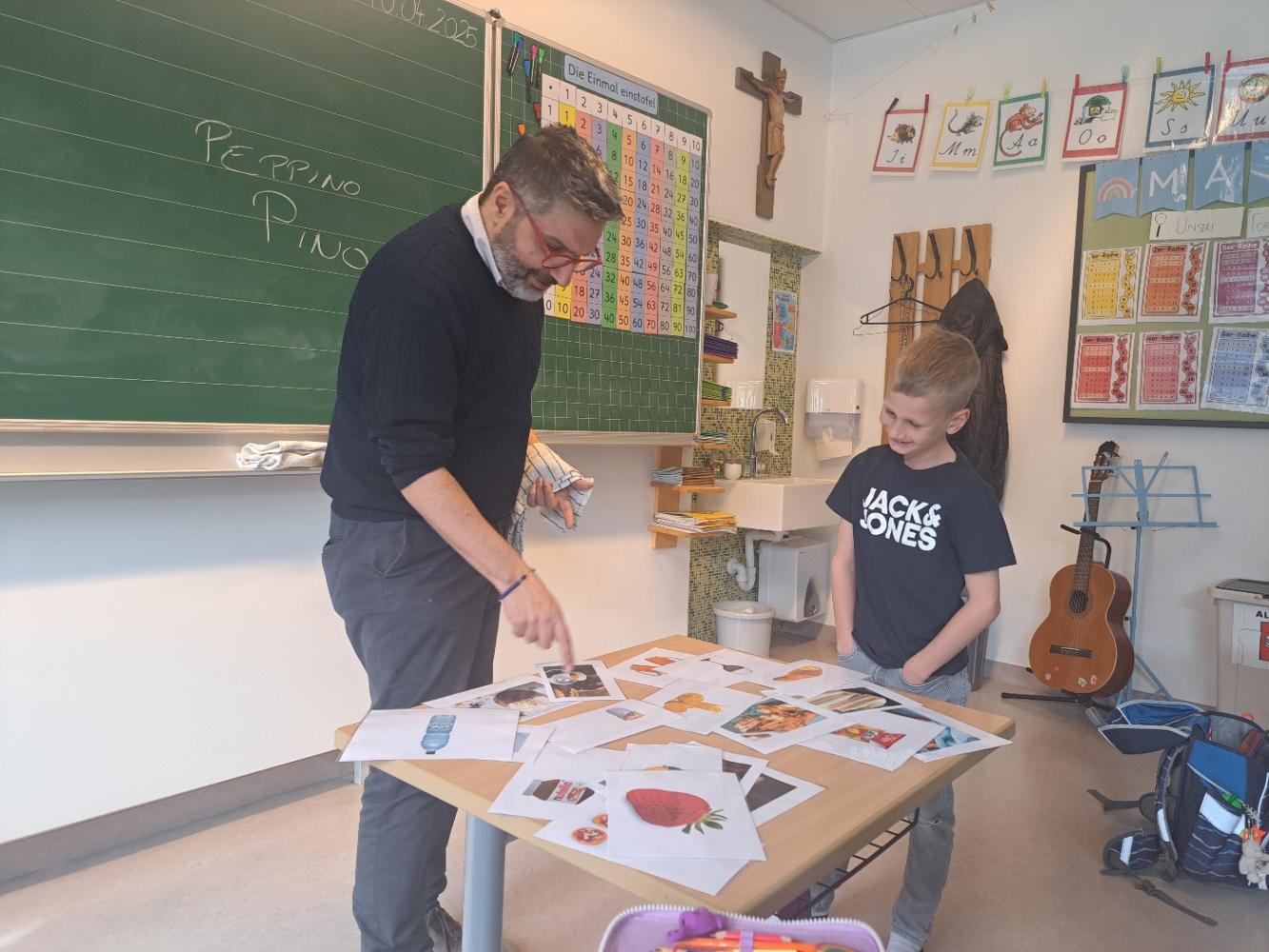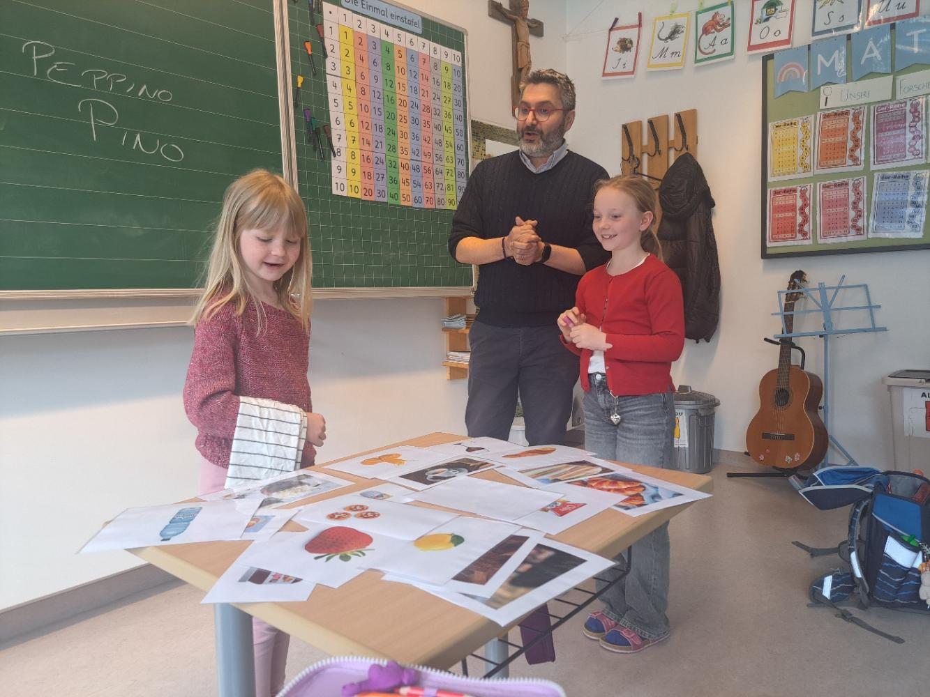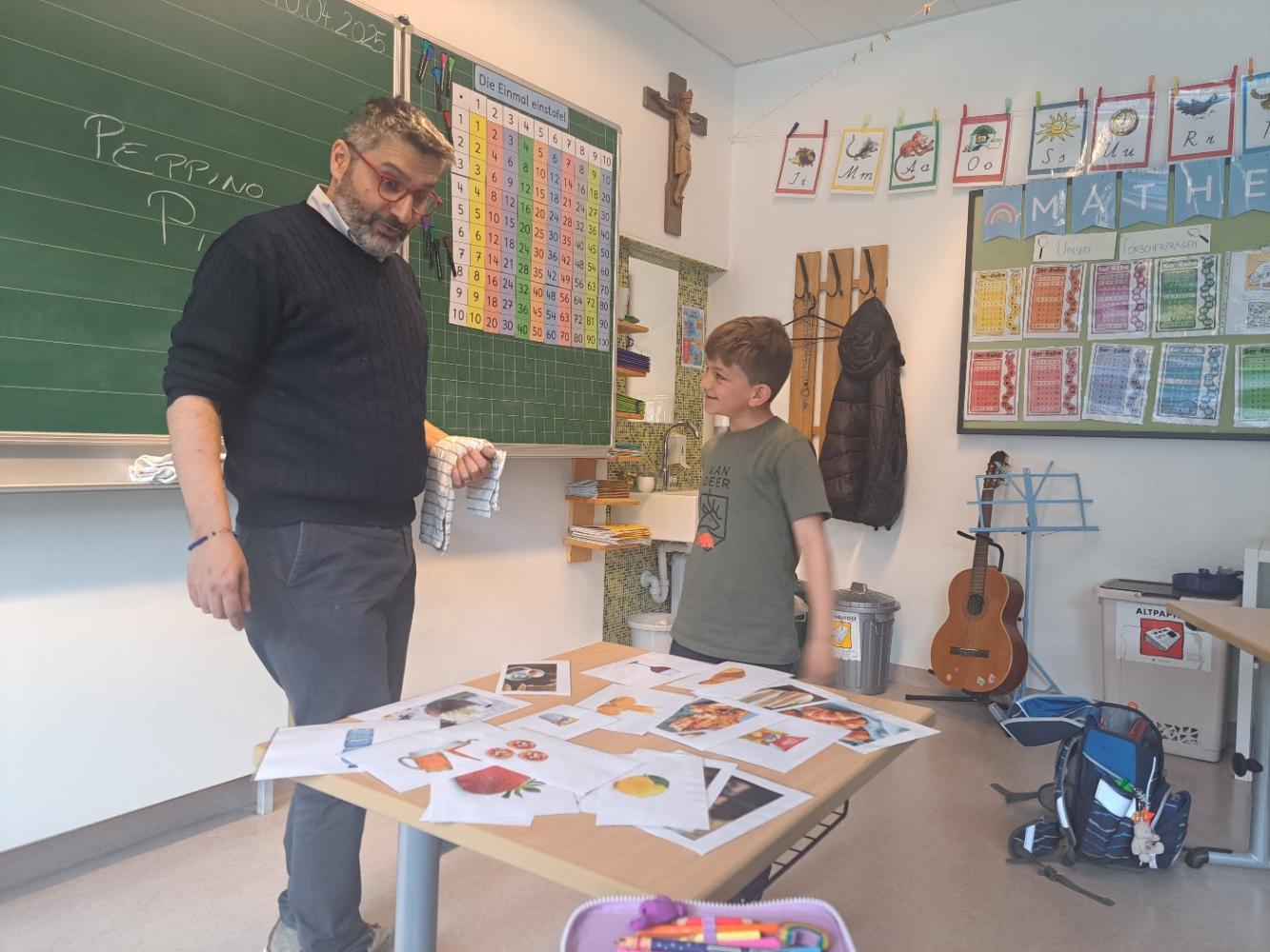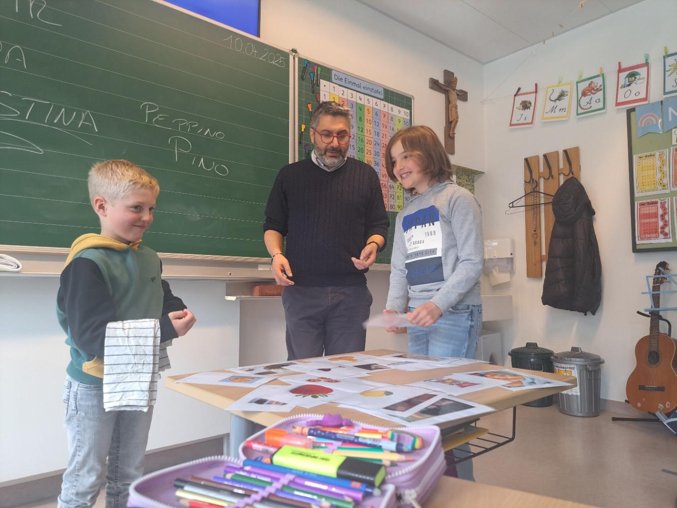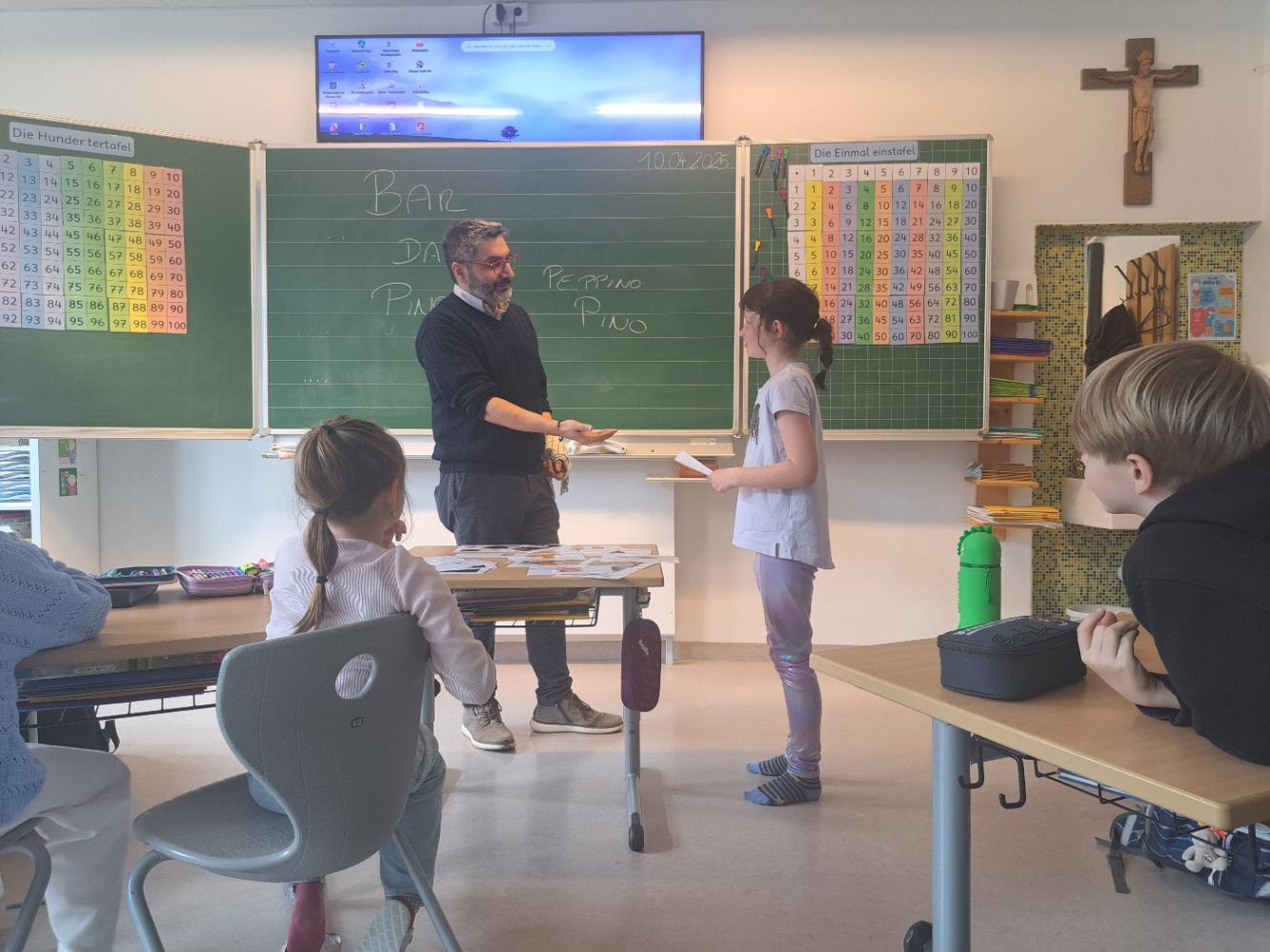 Im Rahmen eines kleinen, spielerischen Workshops gab Peppino den Schülerinnen und Schülern einen ersten Einblick in die italienische Sprache. Mit Liedern, Spielen und viel Humor gelang es ihm, die Kinder für die fremde Sprache zu begeistern. Besonders spannend war es, erste italienische Wörter kennenzulernen – vom fröhlichen „Ciao!“ bis hin zu kleinen Alltagsbegriffen, die sofort ausprobiert werden konnten.