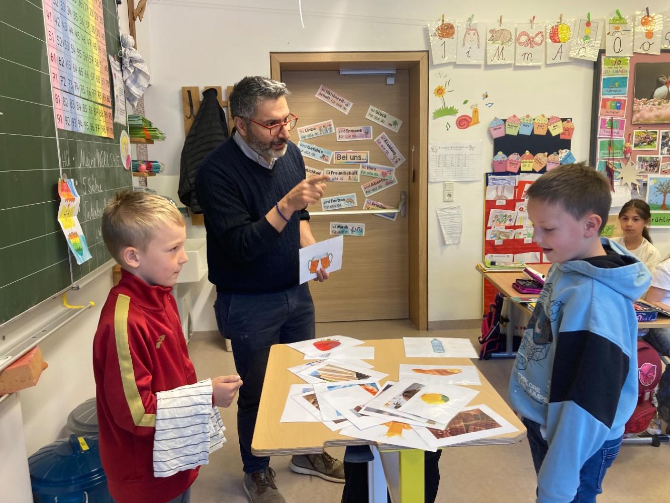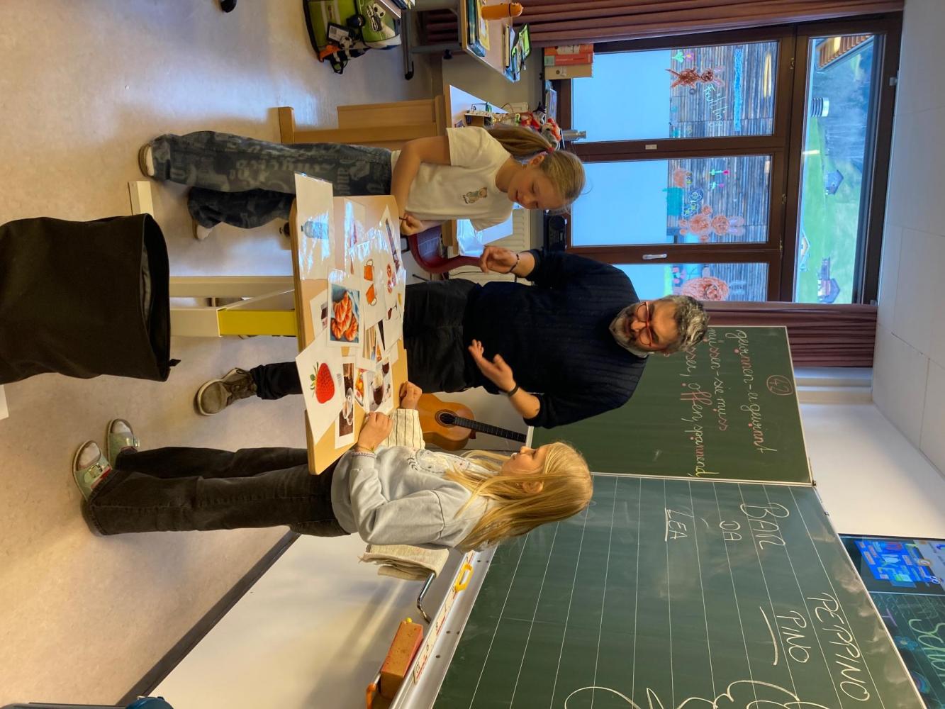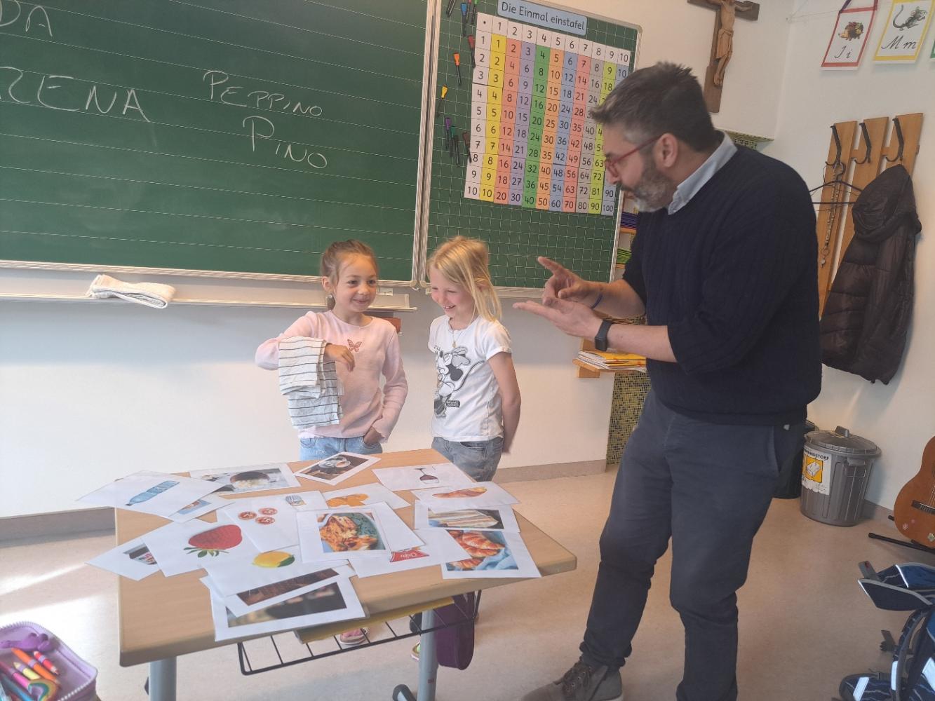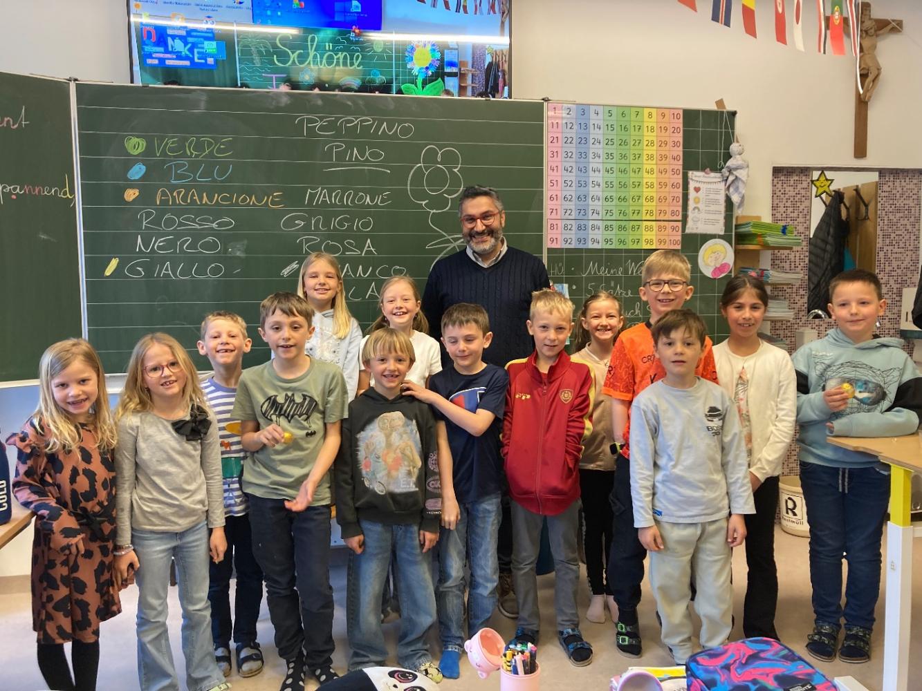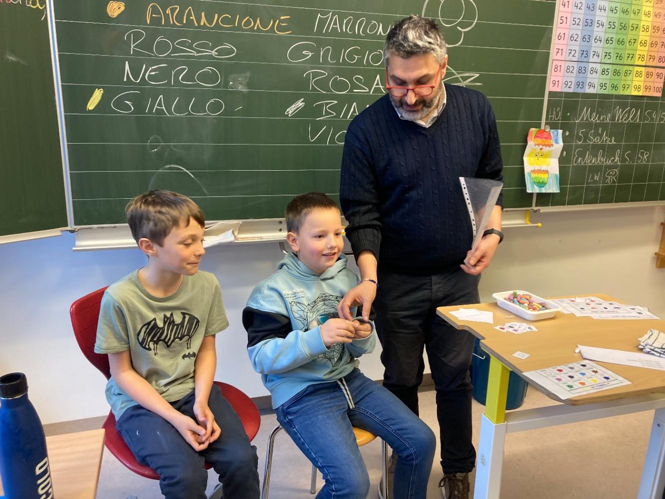 Im Rahmen eines kleinen, spielerischen Workshops gab Peppino den Schülerinnen und Schülern einen ersten Einblick in die italienische Sprache. Mit Liedern, Spielen und viel Humor gelang es ihm, die Kinder für die fremde Sprache zu begeistern. Besonders spannend war es, erste italienische Wörter kennenzulernen – vom fröhlichen „Ciao!“ bis hin zu kleinen Alltagsbegriffen, die sofort ausprobiert werden konnten.