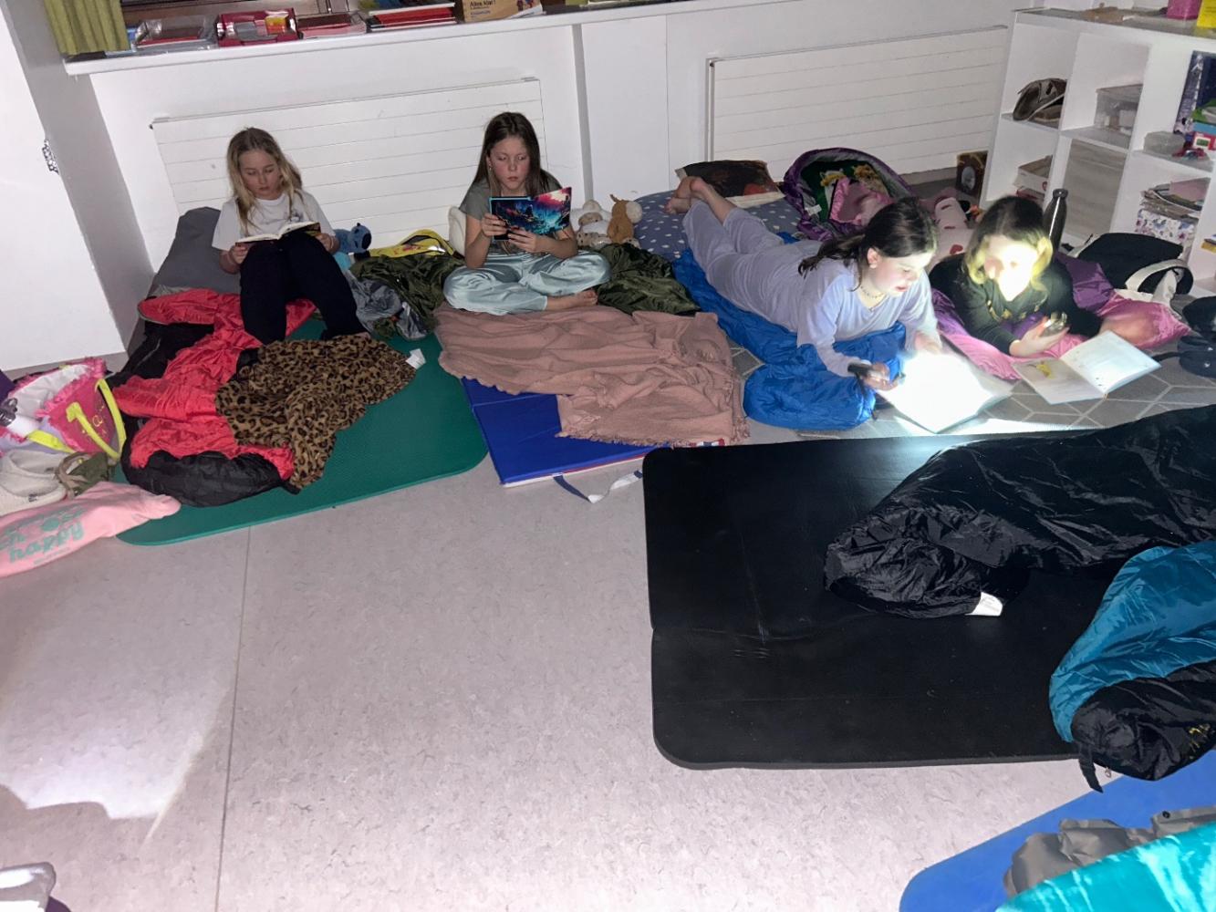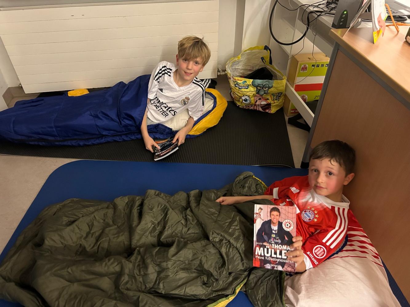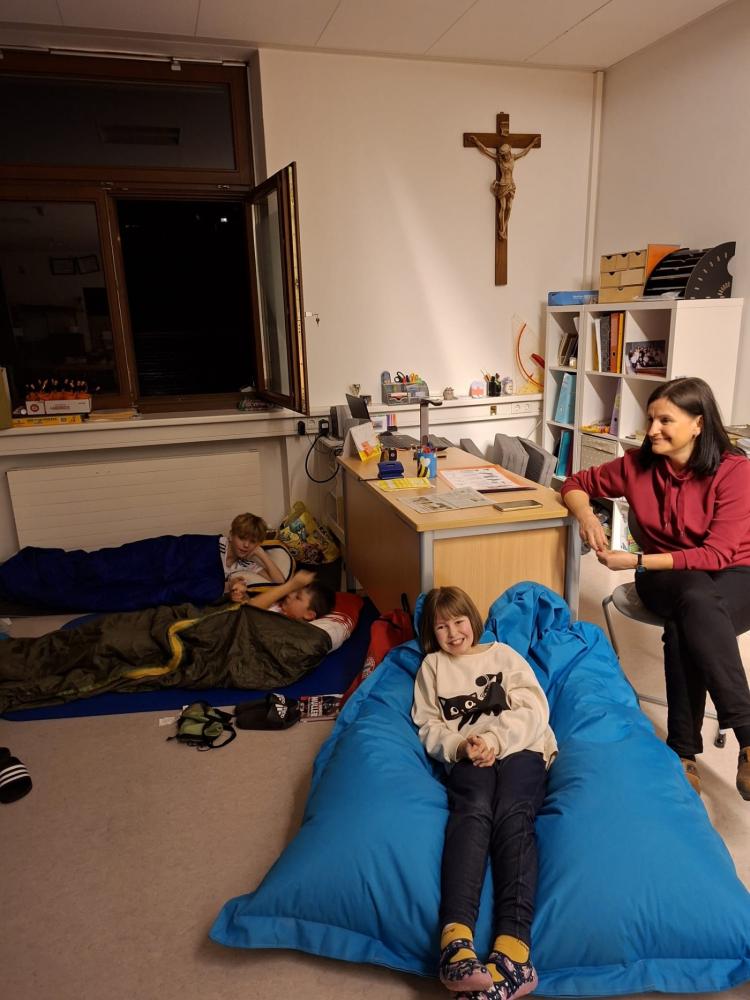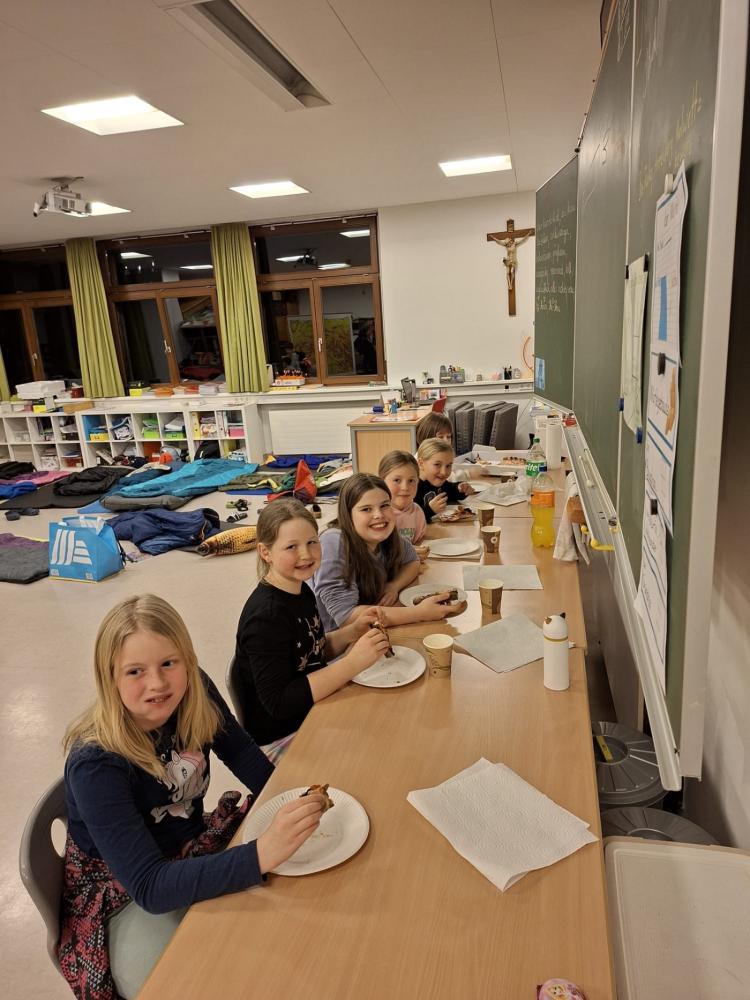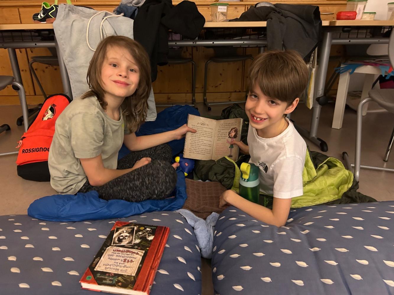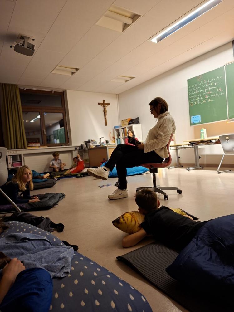 Abends und in der Nacht in der Schule: etwas unheimlich aber ein ganz besonderes Erlebnis! Die 4b verbrachte den Abend vor dem Semesterzeugnistag in der Schule. An verschiedenen Stationen wurde gelesen, geknobelt und geturnt. Nach einer Stärkung kam unser Lesegast Anja und zum Schluss spielten wir noch im Halbdunkeln Völkerball. Die Kinder haben dann (laut eigener Aussage) gut, aber wenig geschlafen und nach einem guten Frühstück den Vormittag (mehr oder weniger aufmerksam) in der Schule verbracht.